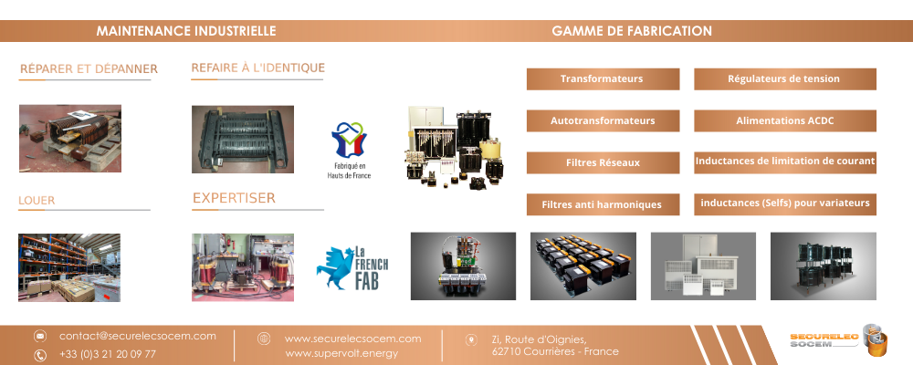 Concepteur et fabricant de transformateurs, inductances et dérivés, nous sommes 30 personnes réparties entre notre bureau d’études, notre service administratif (achats et ADV) et notre atelier de production. Nous réalisons un chiffre d’affaires de plus de 3 millions et demi d’euros (national, export et export indirect). Nous proposons une large gamme de produits de type sec jusqu’à 2 MVA intégrés à de nombreuses applications fixes ou intégrées.